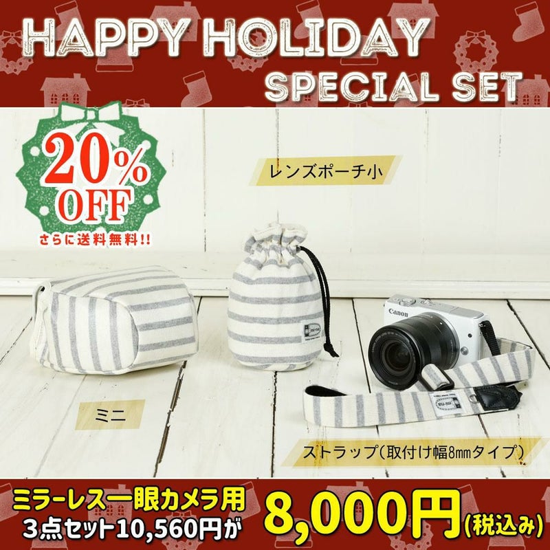 ★期間限定!ミラーレス一眼用 カメラのお洋服ミニとレンズポーチ小と8mmストラップの3点セット(ナチュラルベーシックボーダー)
