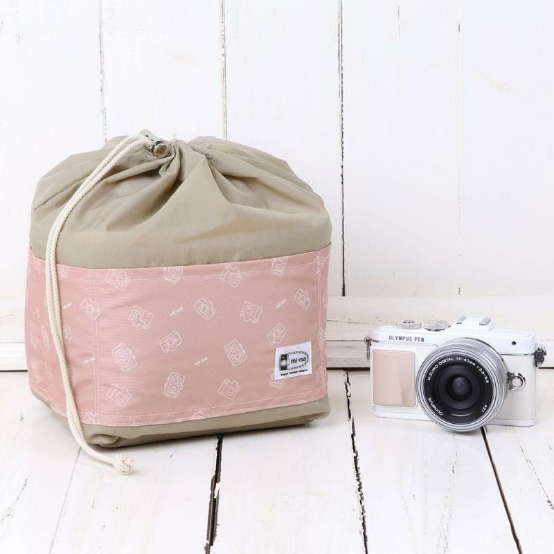 紐をキュッと結ぶと、たっぷり入る巾着型のインナーケースになります。外側には6個のポケットがあり小物を入れておくのに便利です。カメラをすぐに取り出したい方は、紐部分を絞らず、上部を外側に折り返してバッグにセットして頂くとスムーズに取り出し可能です。内側はワントーン明るい色をチョイスしているので中身が見渡しやすいのも魅力です。お手持ちのバッグにこのインナーケースを入れれば安心してカメラを持ち運べます♪