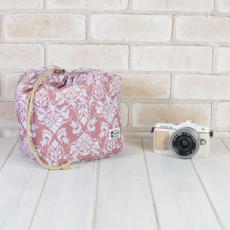 オトメゴコロをくすぐるプリント柄の生地をチョイス!紐をキュッと結ぶと、ころんとかわいい巾着のインナーケースになります。外側には6個のポケットがあり小物を入れておくのに便利です。そして巾着タイプですが、カメラをすぐに取り出したい方は、上部を外側に折り返してバッグにセットして頂くとスムーズに取り出し可能です。お手持ちのバッグにこのインナーケースを入れれば安心してカメラを持ち運べます♪