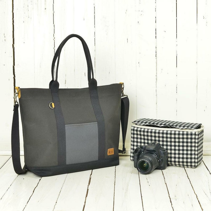 バッグには少し茶色みがかったグレーがオシャレなチャコール×ブラックの11号帆布をチョイス。インナーケースはブラックのコットンリネンのブロックチェック柄を合わせてユニセックスな雰囲気に。内側のオープンポケットもカラーコーディネートされていてさり気なくオシャレ。シンプルなデザインなのでお出かけの装いも悩むことなく男性も納得な兼用カラーも魅力的。カメラバッグを思わせない気軽に持てるトートタイプはカメラを持たない普段使いにもオススメ!