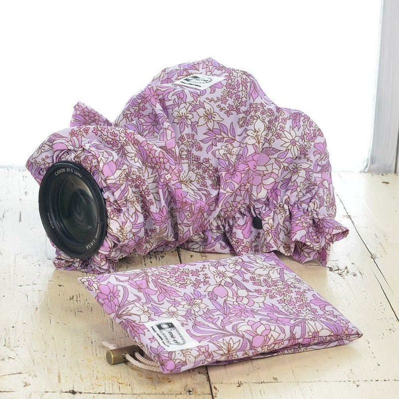 大切な愛するカメラにかわいいレインコートを着せてみませんか。急な雨、子どもとの水遊び、海やキャンプで…などなど水のあるシーンでのシャッターチャンスではカメラにタオルを巻いてしのいだなんていう経験意外と多いのではないでしょうか。巷では高価なレインカバーも販売されていますがカメラ女子さんにはちょっとなんか味気なくて寂しい気持ちになったりもして…そこでちょっとした水滴や水しぶき除け用にかわいいタイプをデザインしてみました。カメラのレインコートを着せたままシャッターを押すことも可能です♪